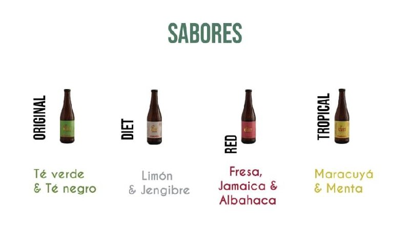 Ingredientes - Primera Fermentación, Té verde y Té negro, Azúcar de caña, cultivos de kombucha,agua purificada , segunda Fermentación, Maracuyá o Fresa o Jengibre & Té de Limón.